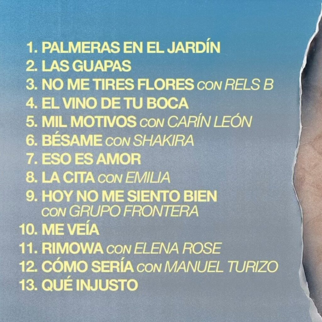 Tras la primera entrega de seis canciones —que incluyó éxitos como Palmeras en el Jardín y colaboraciones como Bésame con Shakira—, el álbum se completa ahora con nuevas piezas y colaboraciones como Emilia, Carin León, Elena Rose y la ya conocida junto a Rels B “No me tires flores”. Entre los temas más esperados se encuentran “Mil Motivos”, “La cita” o “Rimowa”.