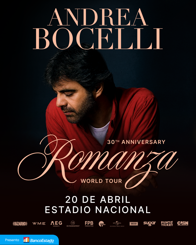 Andrea Bocelli se presentará en Chile, el 20 de abril en el Estadio Nacional y las entradas estarán disponibles en la preventa para clientes BancoEstado desde el lunes 23 de febrero desde las 10:00 (AM), mientras que la venta general se llevará a cabo el miércoles 25 de febrero a las 10:30 (AM) / o cuando se agote el stock de la preventa.