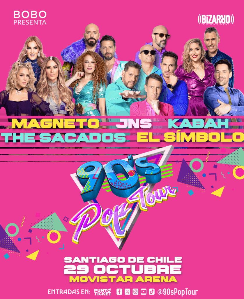 Santiago, 28 de agosto de 2025.-  Son los himnos de toda una generación.  El espectáculo musical más exitoso de los últimos años en América Latina aterriza por primera vez en Sudamérica. El 90’s Pop Tour llega a Santiago este 29 de octubre de 2025 en el Movistar Arena, con una producción de primer nivel y un cartel de lujo que hará vibrar a todas las generaciones.