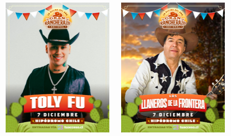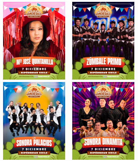 Sobre el escenario se presentarán grandes íconos y bandas consagradas como Zúmbale Primo, Sonora Palacios, Los Llaneros de la Frontera, Los Charros de Luchito y Rafael, Sonora Dinamita, Los Rancheros de Plata, Los Tigres de Parral, Los Rancheros de Río Maule, Los Dinos de Chile, Garras de Amor, Arremacho, Los Bravos de Chile, Líderes de Chile, Kuatreros del Sur, junto a artistas que están marcando fuerte presencia en la música nacional como María José Quintanilla, Toly Fu, JMATT y Benja Duarte.