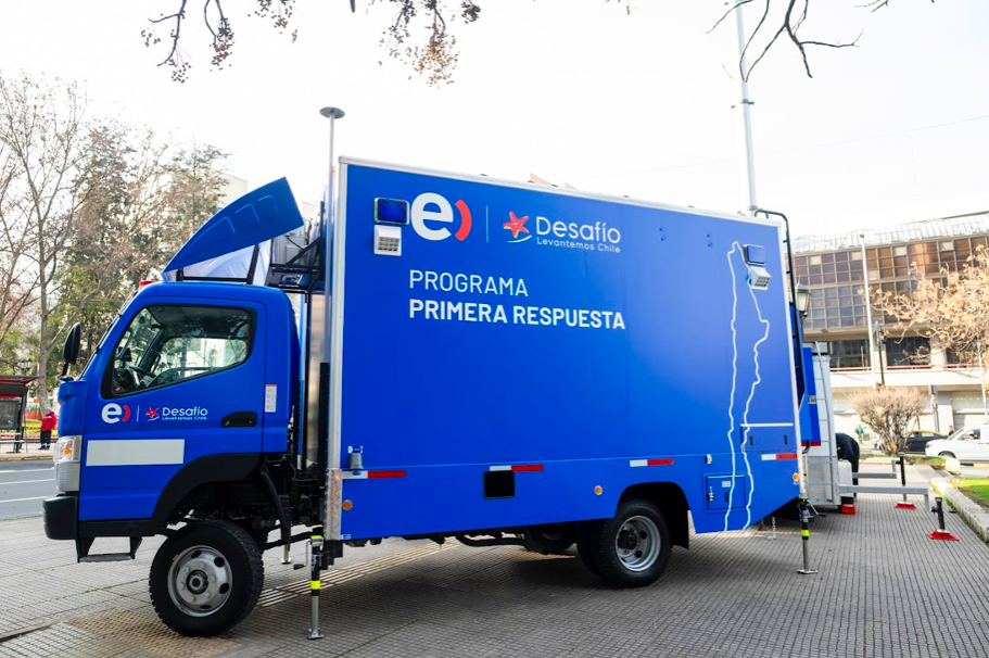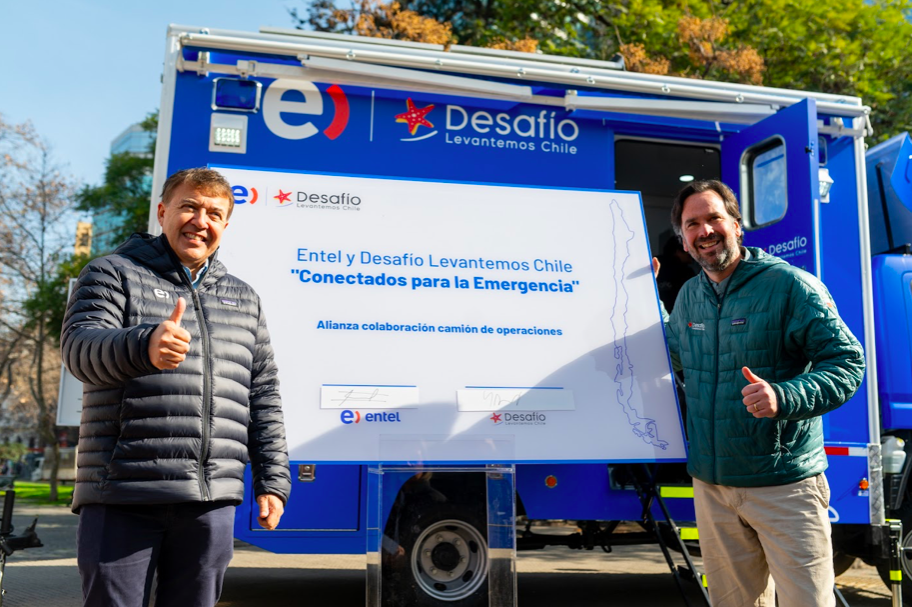 Santiago, 6 de agosto de 2025. Entel junto a Desafío Levantemos Chile presentaron el primer centro de operaciones para emergencias (COE) móvil con conexión satelital, un camión que funcionará para coordinar contingencias y/o catástrofes naturales. El innovador vehículo es parte del Programa Primera Respuesta de Entel y permitirá que la ONG pueda coordinar los apoyos necesarios ante situaciones de emergencia con organismos como Senapred y Conaf, al mismo tiempo será una base operativa para que la compañía de telecomunicaciones pueda coordinar y desplegar a sus equipos en terreno.