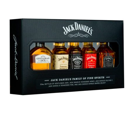 Este regalo está pensado para quiénes quieren conocer la familia de Jack Daniel’s, contiene cinco botellas de 50ML, de los clásicos y preferidos, Old N.7, Honey y dos de la selección premium, Gentleman Jack y Single Barrel.