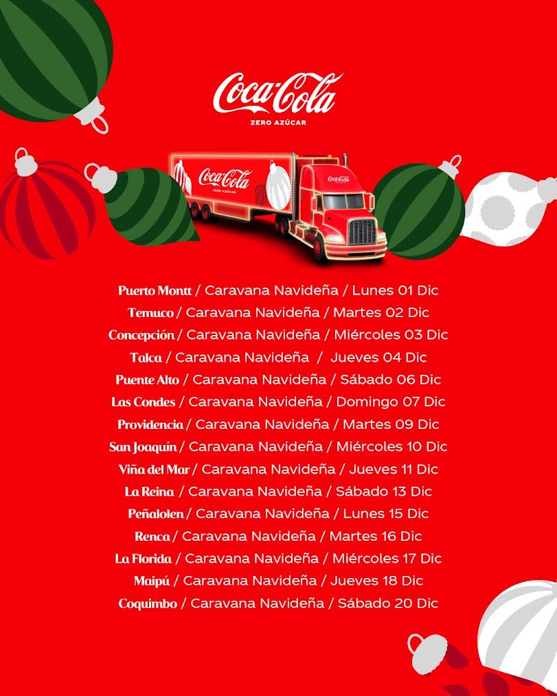 La Caravana Navideña Coca-Cola Zero Azúcar iniciará su recorrido a las 20:00 horas, en las siguientes comunas y fechas: